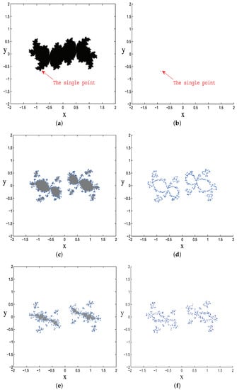 - Repeat steps (III) and (IV) until all points in K are classified. Count all the in each region and define the number as . It is clear that means the number of connected regions, that is, the degree of the fragmentation. Then, the connectivity criterion is defined asThe two extreme cases of connectivity are shown in Figure 3. For the right-side case, the Julia set is totally disconnected; herein, . For the left-side case, since there is a unique blue point and a unique , we define , which makes change in the closed interval [0, 1]. The smaller the value, the better the connectivity.