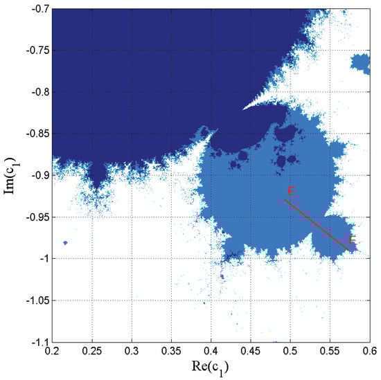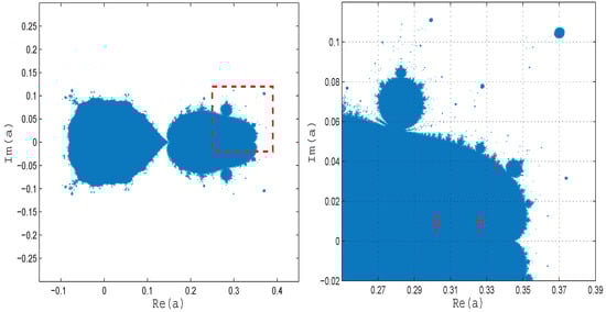 For Example 2, we first give the parameter space of the system (2) in Figure 8, which is calculated based on the bounded trajectory of one of the three critical points (this picture has been shown in Figure 8 in []). As the Figure 8 shows, the light-blue set is composed of all parameter a, which ensure that the trajectory of critical point 1 is bounded. Based on the research in [], the Julia set corresponds to any point in Figure 8 which may have a disconnected structure. Therefore, three points marked as were chosen to illustrate the corresponding Julia sets.