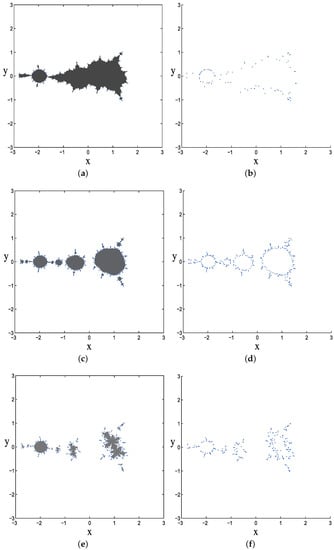 The filled Julia sets of system with different brightnesses based on . (a) , (c) , (e). . (b,d,f): Separate the points corresponding to (a,c,e).