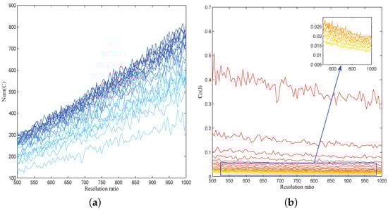 Figure 7 has dual longitudinal axes, which contains blue on the left side, and red on the right side. The results in Table 2 and Table 3 and Figure 7 further verify that can explain the degree of connectivity better than . In Figure 7, the change of is not obvious, but it decreases sharply when the parameter is close to . This is because when the parameters are close to , the main structure of almost disappears. The presents the exponential growth rule when the parameter point tends to . These results testify the effectiveness of our algorithm.