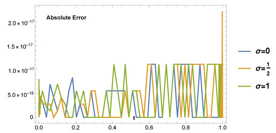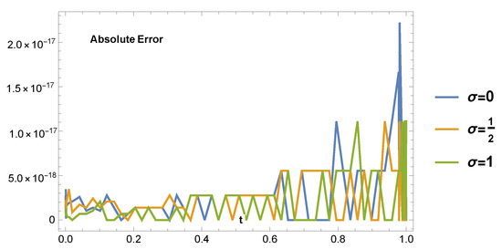 In Figure 3, we depict the absolute error graph of Example 2, for and .