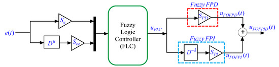 The function is a nonlinear fuzzy function representing input–output mapping of the FLC. As shown in the figure, the overall output control law () of the proposed FOFPID controller is a summation of fractional order integral of with non-integer order () multiplied with and scaled with . Here, input scaling factors () are used to map input linguistic variables in the entire universe of discourse. As for the output scaling factors, and normalize in the range of universe of discourse.