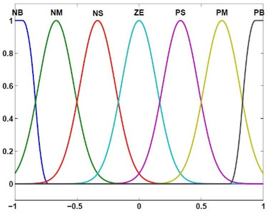 Looking at the internal structure of the FLC of the controller FOFPID, the input signals and the output signal are represented with seven MFs, as shown in Figure 3. Except for NB and PB, Gaussian membership function is used, considering its prominent benefits such as smooth functions, non-zero at all points, and it also provides the actual information at all points. NB and PB are chosen as Z-shape and S-shape membership functions, respectively. The range of MFs is [−1, 1] for both inputs and outputs. The fuzzy rule table used in this study is shown in Table 2, and also the fuzzy control surface is presented in Figure 4. For constructing these rules, the Standard Mac Vicar–Whelan Rule Table is considered, which is gradually increased from NB to PB both for inputs and output [46].