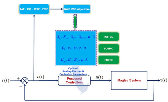 The organization of the article is as follows. The mathematical model of the Maglev system is described in Section 2. The structures of the FOPID, FOSMC, and FOFPID controllers are presented in Section 3. The GWO–PSO algorithm is given in Section 4. The simulation results are given in Section 5. Finally, the concluding remarks are given in Section 6.