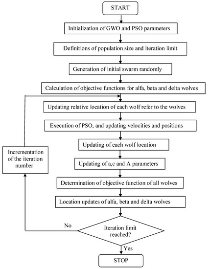 In this work, the Grey Wolf Optimizer is hybridized with Particle Swarm Optimization algorithm for enhancing the progress of the GWO, as presented in [51]. This hybrid optimization method can be regarded for finding efficiently and effectively the global best solution through the optimization process. Therefore, this hybrid GWO-PSO is implemented here for optimization of controller parameters. As a result, the algorithmic representation of the suggested mechanism based on control schemes is described in this section. The flowchart of the GWO–PSO algorithm is shown in Figure 6. The major stages of the presented GWO–PSO based on [51] for tuning the controllers of the Maglev system is listed by steps given below:
