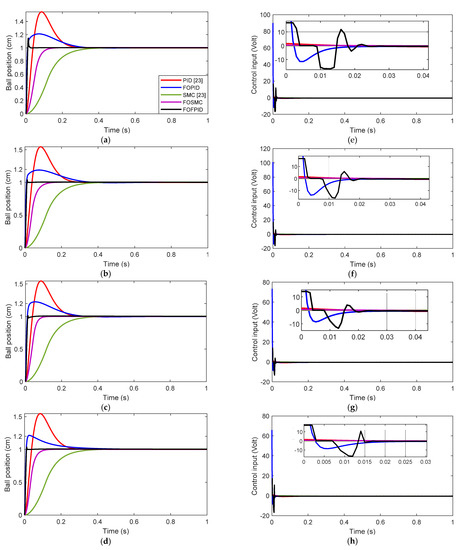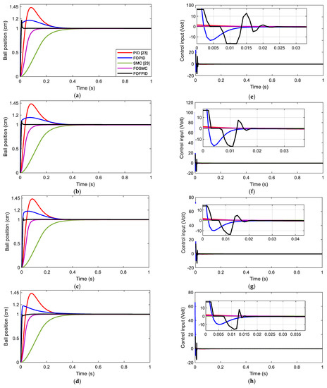 Closed-loop responses (a–d) and control efforts (e–h) for the Maglev system with different controllers based on (a,e), (b,f), (c,g) and (d,h) under parametric variation with +10%.