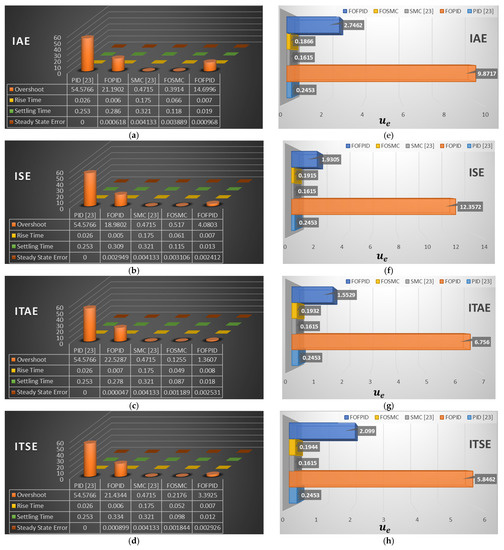 - The proposed fractional order PID and SMC approaches outperform the integer order PID and SMC developed in [23] in terms of overshoot, rise time, settling time, and all objective function values in the presence of internal and external disturbances;