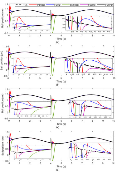 It can be seen from Figure 13 that the proposed FOFPID controller has shorter settling time and better tracking performance, as compared to the remaining controllers. Also, the designed FOSMC approach outperforms the SMC approach developed in [23] in terms of trajectory tracking performance under the external disturbance while consuming almost the similar control energy related to the SMC, as given in Table 6. These findings demonstrate how the parameters in the sliding surface and in the switching function could enhance the flexibility of the FOSMC approach to obtain the desired disturbance rejection capability. In the optimization of these parameters, it is very important to utilize a hybrid swarm intelligence-based optimization algorithm that can provide more robustness and more tracking performance, as compared to that of [23]. As a result, the above discussions are inferred the following observations: