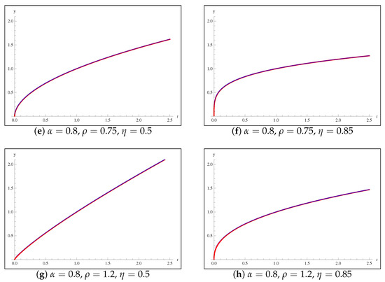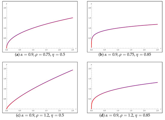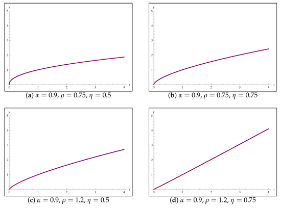 where is the Caputo-type E–K fractional derivative, , and . The exact solution of the IVP (55) is . Numerical solutions of the IVP (55) are plotted in Figure 2 when over the interval for some certain values of the parameters , and . From the numerical data shown in Figure 2, we can notice that the numerical approximate solutions produced using our suggested algorithm exactly match the exact solution.