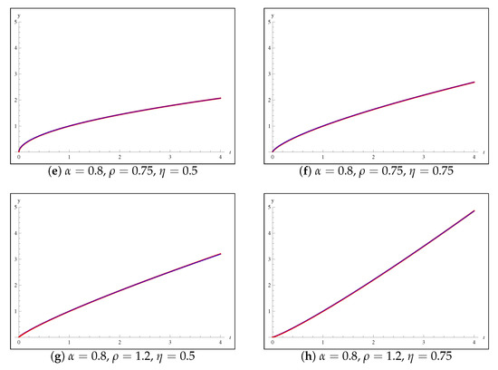 respectively. Comparing (31) with (32), in general, we can conclude that they are not identical. For example, if we take with the parameters , , and then, using Equations (31) and (32), we obtain while . Therefore, the Luchko and Trujillo’s modification and our adjustment of the E–K fractional derivative are not equivalent.