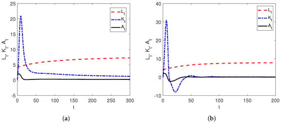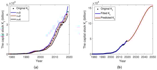 As can be seen in Figure 9a, the fitting result of the medium delay case best matches with original , so we choose it for our thirty-year prediction. It is worth noticing that represents the no delay case, which slightly overestimates the capital stock. It is because means that is merely determined by at time t, while ignoring the historical state. In contrast, the time lag can take into consideration the previous values of economic variables in the capital accumulation process and emphasize the impact of historical data on the current . It offsets the overestimation compared with the no delay case and largely improves the prediction performance. Therefore, we use and to predict when as shown in Figure 9b.