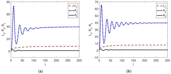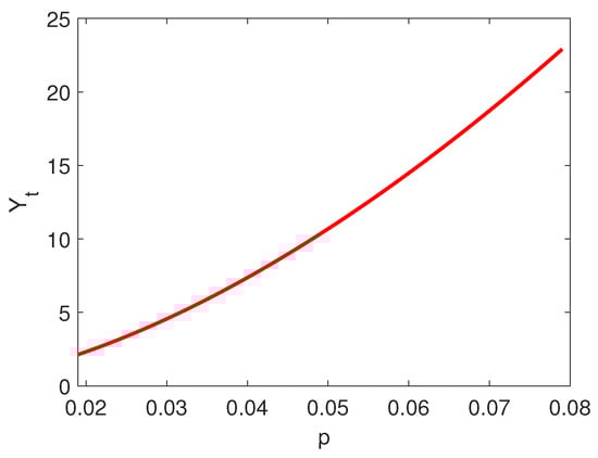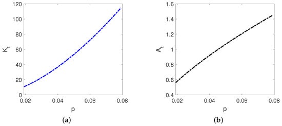 It can be seen that as p increases, the equilibrium value of and are also gradually increasing, which drives GDP to a higher level, indicating economic growth. In system (8), p is TFP growth rate, reflecting the level of technological progress. On the one hand, when p increases, the growth rate of TFP speeds up and stabilizes at a higher level. On the other hand, the acceleration of technological progress promotes capital accumulation, which further has a positive feedback effect on TFP due to endogenous growth. Therefore, under the dual influence of capital accumulation and TFP, the steady-state GDP will rise with the increase in p. The analysis result of the parameter p implies that increasing the TFP growth rate contributes to economic growth. It is consistent with the view that falls in TFP growth appear to explain past growth slowdowns of some middle-income countries [].