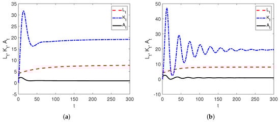 Time delay is a common phenomenon widely existing in economic systems. Since most of the economic processes are not only affected by the present state, but also depend largely on related indicators and factors in the past, the delayed mathematical models are more suitable for depicting economic phenomenon. Therefore, some integer-order and fractional-order differential equation models with time delays are proposed in the economic growth literature, and some significant results have been drawn in recent years. A continuous-time neoclassical growth model with time delay was developed to find erratic fluctuations in the capital accumulation process []. Shortly thereafter, a generalized Cai model with endogenous labor shift was studied by choosing the delay as the parameter and gave some conditions of stability and bifurcation []. Furthermore, the existence and global attractivity of almost periodic solutions were proven for a delayed differential neoclassical growth model []. More recently, a generalization of the Keynesian macroeconomic model was proposed with gamma-distributed lag and using fractional differential equations [].