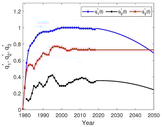 where is 2_norm. To solve (36), for each period t (), we perform a grid search on within the interval (0,1) by step length of . In particular, is figured out by the predictor–corrector method. For , we fit with a quadratic function and forecast its trend in the next thirty years as shown in Figure 6 (the blue line). Using the same method, we can obtain the optimal and by minimizing the prediction error. As shown in Figure 6, (the red line) finally stabilizes at 0.73 around 2020, so we directly let when . As for (the black line), we also perform a quadratic function fitting on and predict its value in 2020–2050.