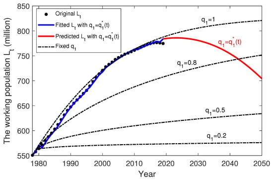 We now describe and analyze the prediction results from economic perspective. In Figure 6, the fractional order peaked around 2010 and then began to decline, leading to a downward trend in the working population () since 2020, as shown in Figure 7. The decrease in the working population was attributed mainly to the government-sponsored family planning program and the so-called “one-child policy” introduced in the 1970s. The policy led to a sharp decline in total fertility rate and the acceleration of population aging []. Consequently, the shrinking of the working population occurred and will probably continue in the approaching half a century [].