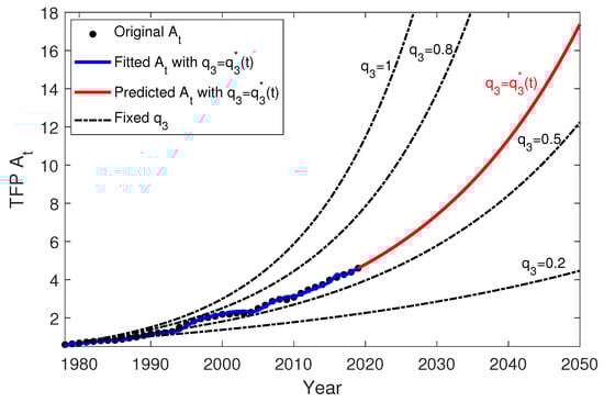 As for the prediction of TFP, since the fractional order reached a plateau after 2000, fluctuating slightly around 0.73, TFP in 2020–2050 will probably continue to increase following the previous trend. In a developing country like China, the increase in TFP is largely caused by the “catch-up effect” which comes from the process of catching up from post-developed countries to developed countries. Evidence from multiple nations shows that if developing countries make full use of the advantages of chasers, they have the opportunity to accelerate development [].