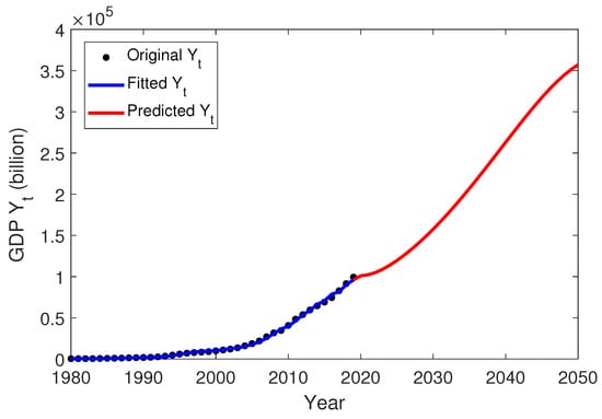 Finally, by using and the predicted values of , , and , we can easily get the predicted GDP () for each year, as shown in Figure 10.