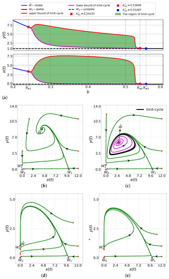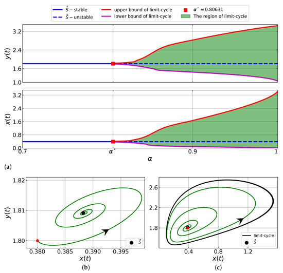 Based on parameter values (29) and Theorem 7, we can find a critical value such that the interior point is asymptotically stable if and it is unstable if . In order to observe such behavior, we plot the bifurcation diagram for , see Figure 4a. It is observed that the interior point is asymptotically stable when . If , then the interior point loses its stability and all numerical solutions converge to a limit-cycle via a Hopf bifurcation. The Hopf bifurcation can also be observed from the phase-portraits shown in Figure 4b for and Figure 4c for .