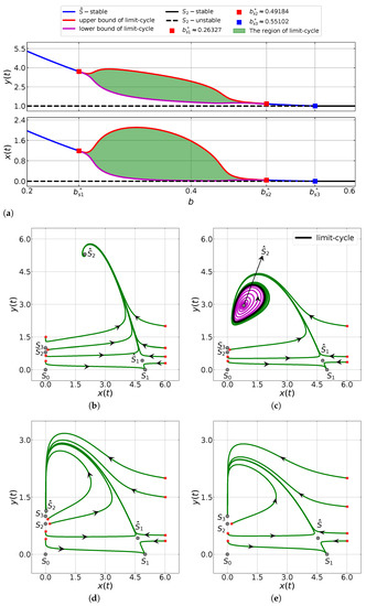Here, we also take . We notice that the predator extinction point is always asymptotically stable, see Theorem 5b. Then, by varying b from to , we plot the bifurcation diagrams for both predator and prey population in Figure 2a. It is found that the system (6) in this case has similar qualitative behavior as in the previous simulation (see Figure 1 and Figure 2), with the exception of the stability properties of the predator extinction point . In the first simulation, the predator extinction point is always unstable while, in the latter case, it is always locally asymptotically stable. The local stability properties of the predator extinction point can be clearly observed from the phase portraits depicted in Figure 2b–e.