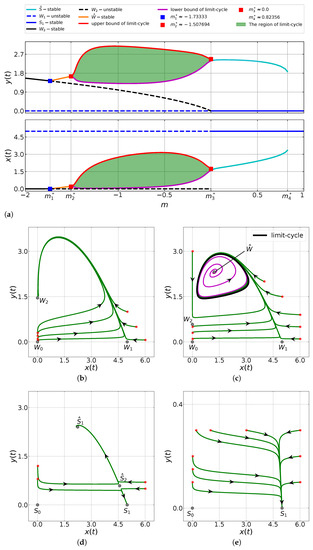 In order to provide a better view of the dynamics of the system (6) with parameter values (28) and , we ploted several phase-portraits for different values of m in Figure 3b–e. Figure 3b shows the phase-portrait of the system (6) with . Here, we have and . According to Theorem 3c, the prey extintion point is asymptotically stable. Figure 3b confirms this behavior where all numerical solutions converge to the prey extinction point . The phase portrait of the system (6) with is depicted in Figure 3c. In this respect, we have and . Thus, the stability condition of the interior point in Figure 3c, where all numerical solutions of the system (6) are convergent to a limit-cycle. The appearence of a stable limit-cycle indicates the presence of a Hopf bifurcation in the system. Next, we consider a case of by choosing . The phase-portrait in Figure 3d shows that numerical solutions are convergent to the predator extinction point or to the interior point , depending on the initial conditions. Hence, the system (6) exhibits a bistability phenomenon. Finally, if we take , then we have situation where the interior point disappears and the predator extinction point becomes the only equilibrium point which is asymptotically stable. This behavior is plotted in Figure 3e.