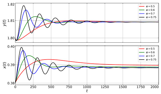 In Figure 4a, we observe that the order of the fractional derivative does not affect the stability of the interior point as long as . To verify this property, we plot in Figure 5 the time series of both prey and predator populations for . It is shown that all solutions are indeed convergent to the interior point , but the solution of system (6) with a higher–order fractional derivative has faster convergence.