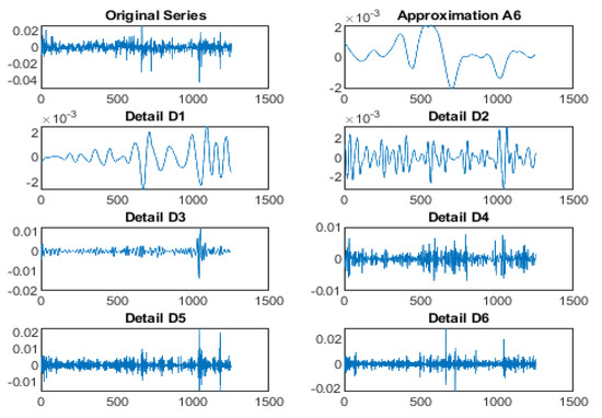 This means that the wavelets permit to deduce the decomposition of the series S at different levels from each other by means of the filters (discrete wavelet low-pass filter) and (discrete wavelet high-pass filter).