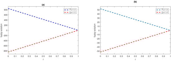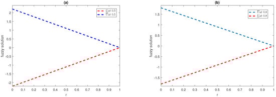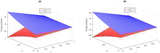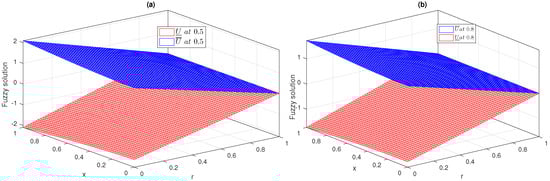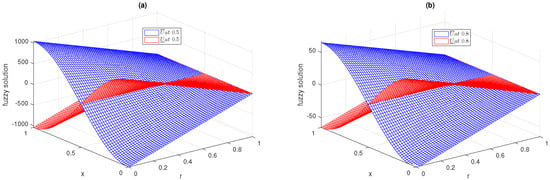 The first example is of a fuzzy heat equation of fractional order having the external source term along with a fuzzy initial condition as in [,,], as follows: -5.0cm0cm