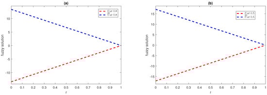 2-D fuzzy upper and lower branch plot of semi-analytical series solution up to first four terms at , and at for Example 1.