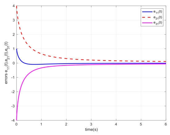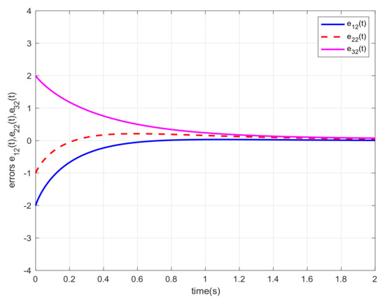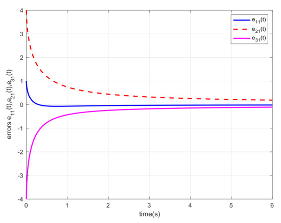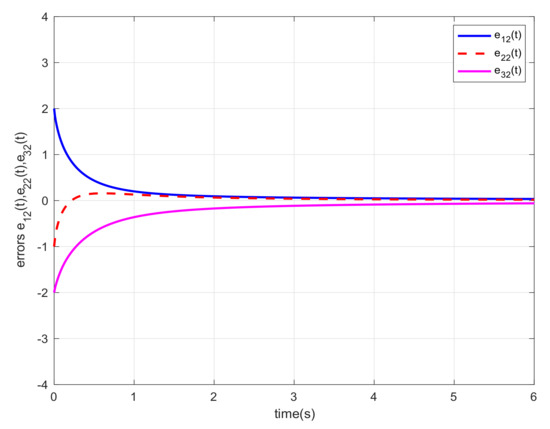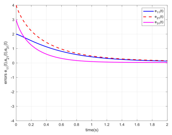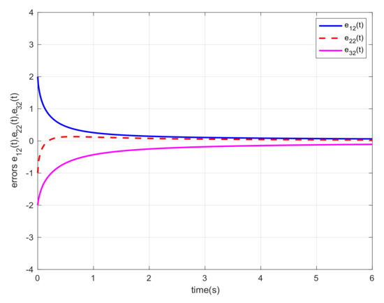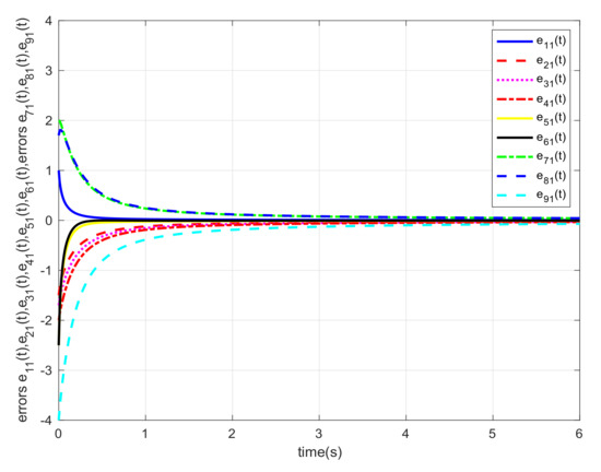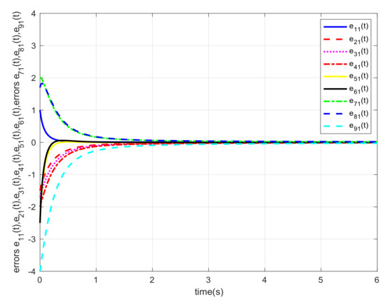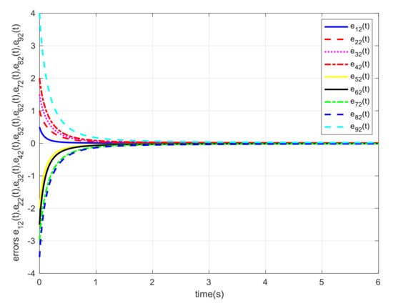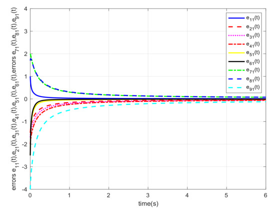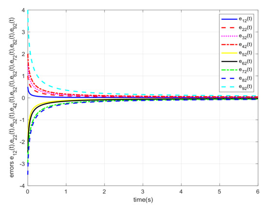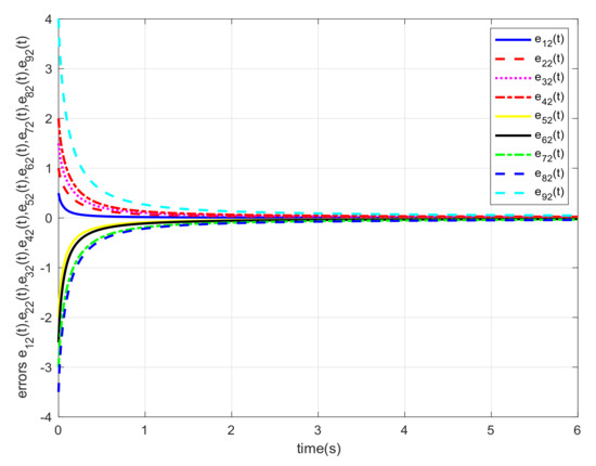Let us choose and the initial states , , and . For different orders α, we also carried out the simulations and gave the corresponding error trajectories of this system. When order , we show the consensus errors versus time of the agents in Figure 2, Figure 3, Figure 4, Figure 5, Figure 6 and Figure 7, respectively. From the numerical results, we verify that and tend fast to 0, which means that the guaranteed cost consensus of the system can be achieved. The upper bound of the guaranteed cost function can be obtained. Moreover, by denoting , we also carried out the curve of . From Figure 8, we could note that the order influence on consensus property with varying orders. With the higher orders, the system consensus’s error will be achieved more rapidly.