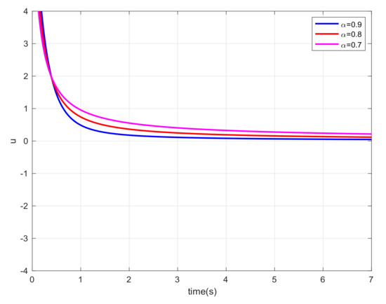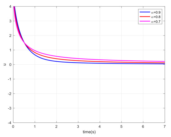 Let us select and the initial states , , and . Similar with Example 1, we also carried out consensus error curve of system with different order. The simulation results are shown in the Figure 10, Figure 11, Figure 12, Figure 13, Figure 14 and Figure 15, respectively. From these numerical results, we verify that and approach 0 very fast, meaning that the guaranteed cost consensus of the system is obtained. Additionally, the upper bound of the guaranteed cost function is . By plotting the curve of shown in Figure 16, one can note that the system will achieve consensus more rapidly when the order increases.