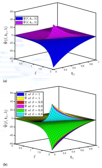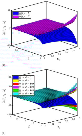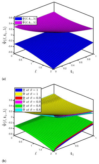 Three-dimensional plot of of Problem (4): (a) and when ; (b) and when the uncertainty parameter has different fractional orders.