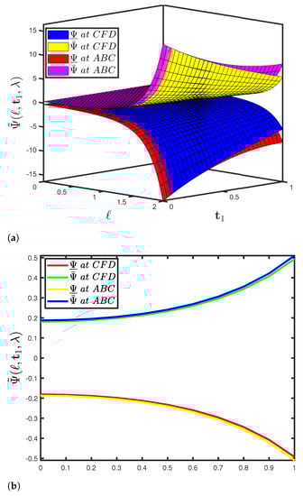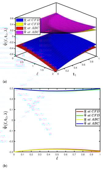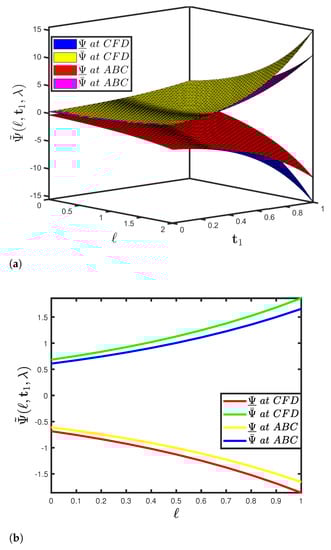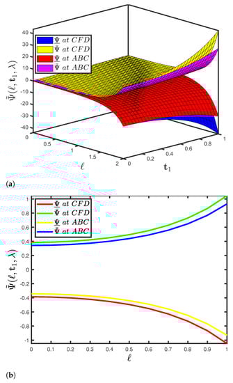 Comparison plots of of Problem (3) when fuzzy CFD and ABC are considered to have a fractional order and uncertainty parameter : (a) three-dimensional plot; and (b) two-dimensional plot of and when .
