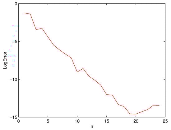 Interestingly, the problem has exact solutions for some values of α. For the case of , [,] . By applying the method of FDCHPs pseudo-Galerkin, with shifting the given interval to , we obtain after four iterations as a MAE. On the other hand, the method in [] obtained a MAE of almost after iterations.
