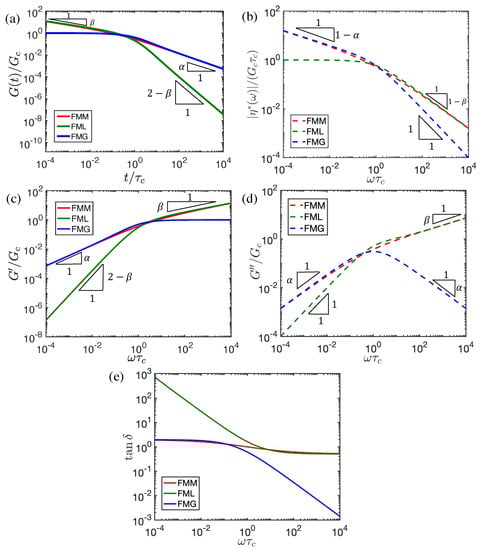 Representative plots of the linear viscoelastic properties of the Fractional Maxwell Model (FMM) (), Fractional Maxwell Liquid (FML) () and Fractional Maxwell Gel (FMG) (). (a,b) show the relaxation modulus and the frequency dependence of the complex viscosity for the FMM, FML, and FMG models, respectively. The storage modulus (c), loss modulus (d), and the phase angle (tan) (e) are also presented for the FMM, FML, and FMG models, respectively.