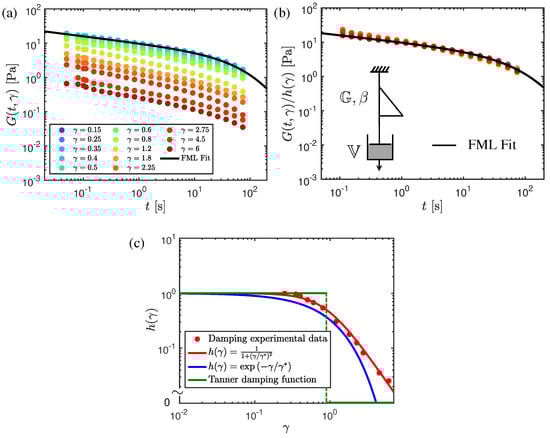 In polymeric systems, the damping function that enters Equation (25) is related to the survival probability of network chains after the application of a large deformation [,]. The non-linear response of a given material can be calculated from measurements of the strain-dependent relaxation modulus . Values of the strain-dependent relaxation moduli for a 0.5 wt.% solution of xanthan gum in water are shown in Figure 3a. For strain amplitudes up to , each measurement of the relaxation modulus overlapped on top of one another, corresponding to the linear viscoelastic response. This response is well described by the non-linear regression of the data to the FMM model with Pa·, , Pa·s, and . The characteristic relaxation time (corresponding to an appropriate moment of the relaxation spectrum) is thus = 98.9 s. However, for strain amplitudes , there is a clear softening of the material with large deformations reducing the strain-dependent relaxation modulus. In fact, at the largest strain (), the relaxation modulus of this complex fluid at any time t decreases by a factor of fifty. It is also clear that the functional form of each measured response in Figure 3a is self-similar and the data show that the material follow a principle of time-strain separability [], so that is consistent with Equation (25). The damping function for this complex fluid can, thus, be found directly from experimental measurements by collapsing the strain-dependent relaxation modulus onto the linear relaxation modulus as shown in Figure 3b using the relation: