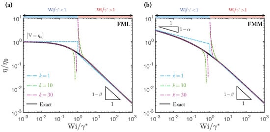 The asymptotes at low and high Wi are dominated by the terms in Equation (45). The asymptotes can be directly calculated from Equation (45), and for cases when the inequalities in Equation (46) or Equation (47) are not satisfied (i.e., when or ), we evaluated the asymptotes from Equation (31) (see Appendix A for more details).