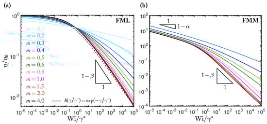 This asymptotic behavior of the steady shear viscosity and its dependence on the strength of the non-linear damping is illustrated visually for the FMM and FML models in Figure 5. The rate of shear thinning at high shear rates is independent of m for all cases when . It is also very close to the result obtained for exponential damping (shown by the black dashed line). This suggests that as long as the non-linear strain damping described by Equation (42) is sufficently strong ( ), the rate of shear thinning in the steady shear viscosity is set by the linear viscoelastic properties () of the material. This analysis provides a rationalization for why a variety of different functional forms for the damping functions used in the literature are all able to provide a good prediction of the rate-dependent viscosity.