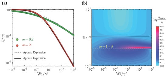 To evaluate the rate-dependent viscosity from Equation (48), we require the values of the three parameters in the FML model that describe the linear rheological properties of the complex fluid () and the damping exponent m for describing the strain dependence of the relaxation modulus . In Figure 6a, we compare the compact expression for the rate-dependent viscosity given in Equation (48) with a numerical evaluation of Equation (31) for two different values of m: a strong damping case, ; and a weak damping case, . It can be seen that Equations (48)–(50) capture the correct asymptotic limits at high and low shear rates, but do not precisely capture the gradual transition in the shear viscosity around . A contour plot comparing the proposed viscosity approximation given in Equation (48) with the numerical integration of Equation (31) using the generalized damping function of Equation (42) is presented in Figure 6b. The error is only substantial for the unlikely condition where , i.e., when the damping parameter and the FML power-law exponents () are equal to each other. By contrast, for strong damping cases with , the error incurred in using the viscosity form given by Equations (48) and (49) is always less than 7.5% across the whole range of shear rates.