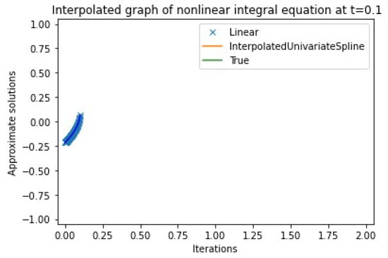 Using Python, a well known scientific computer program, in order to obtain the interpolated graphs of nonlinear integral equation for two cases, and , we get the following interpolated graphs, Figure 1 respectively, Figure 2.