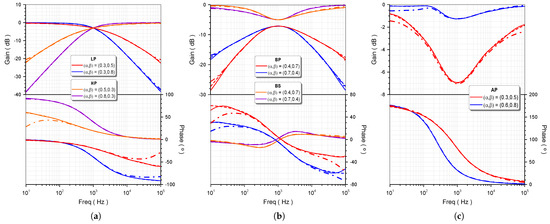 The experimental gain and phase were measured using an Agilent 4395A spectrum analyzer within the frequency range Hz, and the resulting responses are given in Figure 5a for the LP and HP filter types; in Figure 5b for the BP and BS types; and in Figure 5c for the AP filter type, indicated by triangle symbols, along with the respective results obtained from the curve-fitting-based approximation (solid lines) and the theory (dashed lines).