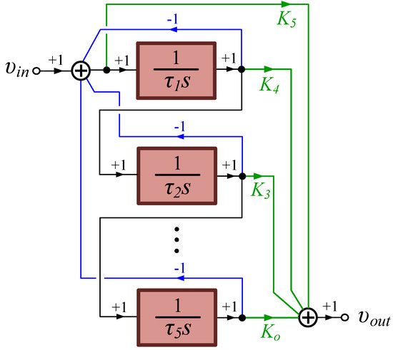 The proposed concept was experimentally evaluated using FPAA hardware, and in particular, an Anadigm QUAD AN231K04 development kit, which is controlled through the AnadigmDesigner 2 EDA software [14,15,16,17,18]. Employing an integrator-based follow-the-leader feedback (FLF) structure, which is depicted in Figure 2, considering a 5th-order approximation, the transfer function that describes this functional block diagram is the following: