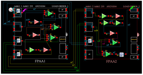 The implementation of the FLF structure in Figure 2, using the FPAA hardware, was based on the configuration that is demonstrated in the Anadigm design of Figure 3. Two FPAA chips were required when Integrator, GainHold and SumDiff Configurable Analogue Blocks (CABs) were utilized to implement the integration and scaling stages, and the chip clock was set at MHz. The experimental setup that was used is shown in Figure 4.