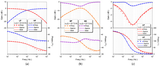 The efficiency of each approximation method was evaluated through the gain and phase frequency responses of Figure 1, obtained using the MATLAB software, where the Oustaloup results are indicated by dashed-dotted lines and the curve-fitting-based results by solid lines. Considering the associated ideal responses, which are indicated by dashed lines, the difference between the accuracy of the two methods is evident. In particular, the maximum integral absolute error (IAE) on the gain for the LP, HP, BP, BS and AP filter types was about dB·Hz and in the phase °·Hz in the case of the Oustaloup method. The corresponding values, in the case of the proposed approximation procedure, were dB·Hz and °·Hz. Consequently, the proposed approximation process offers not only a considerably compact transfer function that can be implemented with the requirement of minimum circuitry, but also a sufficiently accurate approximation over the entire frequency range of interest.
