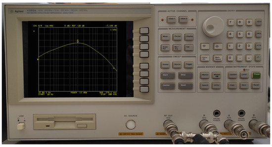 Screenshot of the Agilent 4395A spectrum analyzer, showing the gain frequency response during the measurement of the BP type of filter for orders .