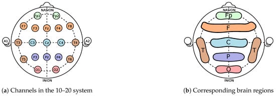 EEG signals can be obtained through the use of invasive and noninvasive electrodes. Noninvasive electrodes are widely used for their convenience and allow for capturing information with less risk to the patient. Invasive electrodes are mainly used when one needs to capture information from an internal region of the brain where noninvasive electrodes are insufficient. In general, typical EEG equipment uses noninvasive electrodes normally placed in caps or attached to the scalp []. Usually, EEG data collection follows standards such as the International 10/20 scheme, which is detailed in Section 3.