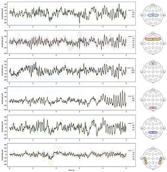 Representation of the EEG TS of a random patient (Subject 00) during the mental task (activity dataset). For visualisation purposes, only the interval between 0 and 5 s is shown. Each subplot concerns one of the six brain areas presented in Figure 1. The black lines represent the average signal for each area, and the colored ones represent the original channel signals.
