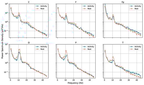Power spectral densities (PSDs) are widely used in signal processing and describe the energy density or power spectral of a signal according to a determined frequency range []. In the case of EEG signals, this tool can transform complex time series into directly interpretable information that can be categorised according to frequency bands and brain waves []. In summary, Welch’s method [] partitions the data into smaller segments and computes a widowed discrete Fourier transform (DFT) at a determined frequency for each segment. A complete description of the method can be found in [].