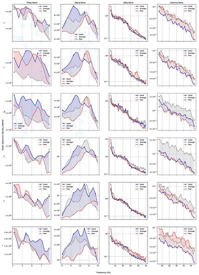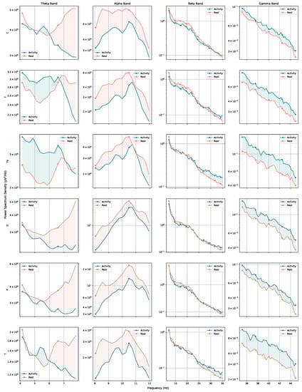 In this context, Figure 4 presents the same data content as Figure 3 but scaled individually and categorised according to frequency bands pertaining the basic brain waves described in [], namely the theta (for frequencies between 4 and 8 Hz), alpha (8–12 Hz range), beta (12–35 Hz range), and gamma (35–45 Hz range) bands. Considering the space restrictions, we omitted the delta band (0.5–4 Hz range) in this figure since it is the less relevant frequency range for this study (since it mainly describes sleep and dreaming states).