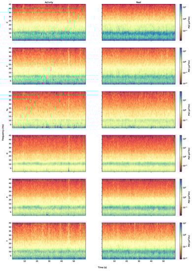 Comparison of the spectrograms between activity (left) and rest (right) datasets (considering the average for all 36 subjects).