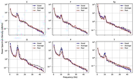 Comparison of the power spectral density between good, average, and poor performers (considering the average for each group of 12 subjects).